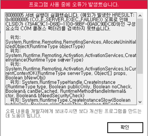 문의하신 오류는 채점프로그램 실행 중 윈도우에서 발생하는 오류입니다. 윈도우 환경으로 인해 발생하는 문제는 저희가 명확한 답변을 드리기 어려운 점 양해 부탁드립니다. 우선은 [오피스 프로그램 삭제 > PC재부팅 > 오피스 재설치] 후 다시 한번 확인 부탁드립니다.