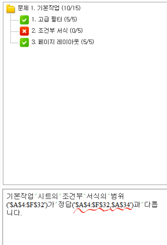 실전모의고사 A형 기본작업 2번- 조건부서식을 문제에는 "[A4;F32]영역에서 ~로 적용하시오."라고 나와있는데 수식은 전부 맞게 적었음에도 채점프로그램을 돌리니 위 사진처럼