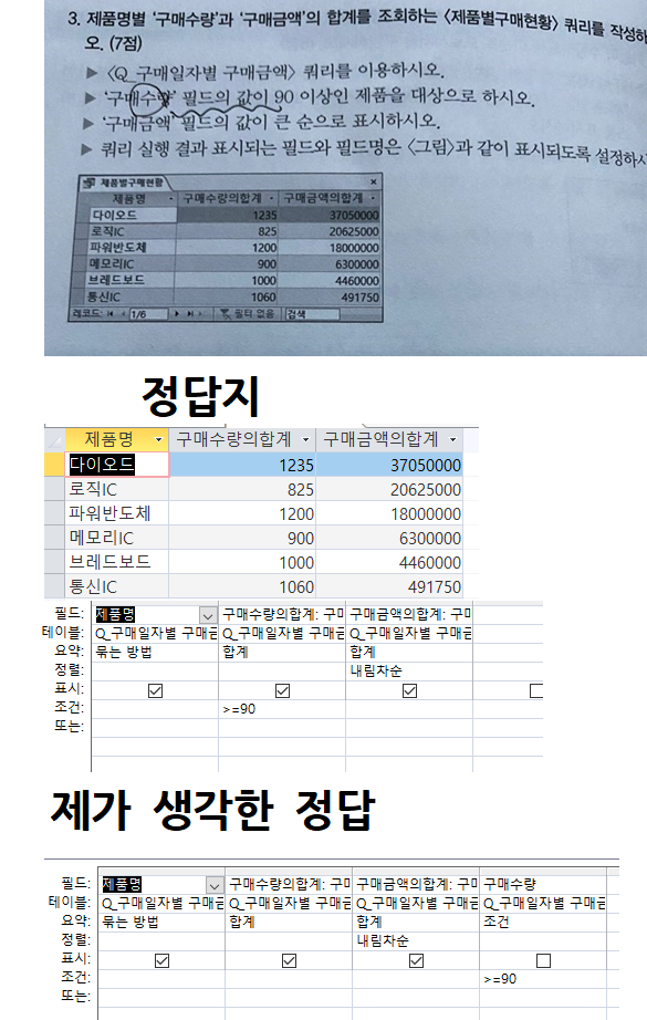 3.제품명별 '구매수량'과 '구매금액'의 합계를 조회하는 <제품별구매현황>쿼리를 작성하시오.(7점)