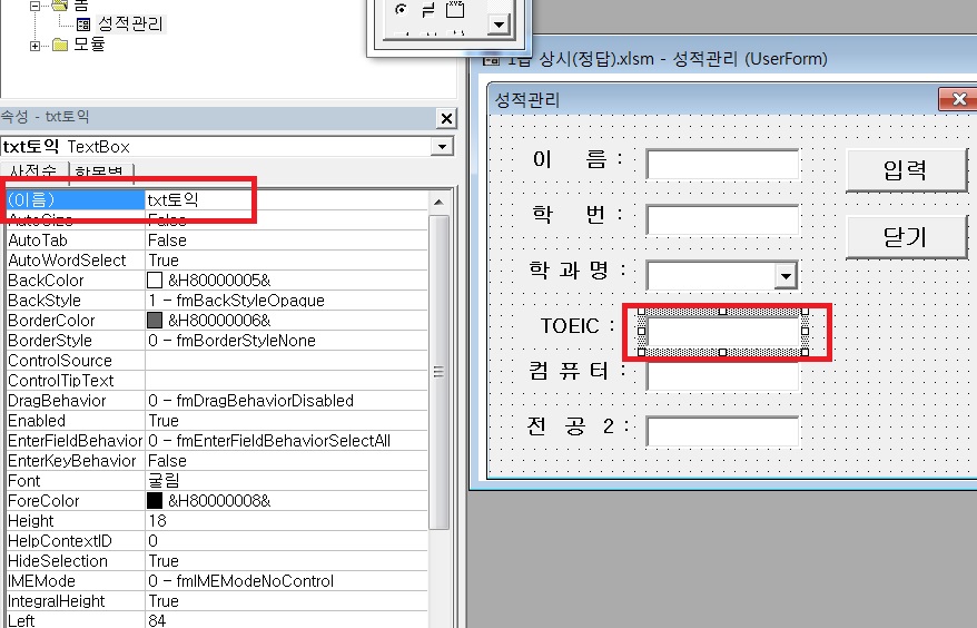 컨트롤의 이름이 txt토익 이기 때문에 txt토익으로 작성한 것입니다.