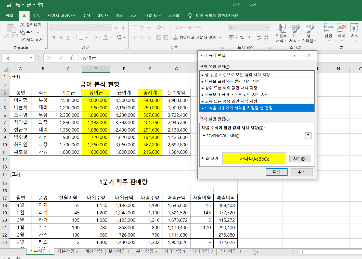 column, isiven 함수를 이요해서 열 번호가 짝수인 열 전체에 대하여 채우기 색을 노란색으로 적용시키는 조건부 서식 문제입니다.