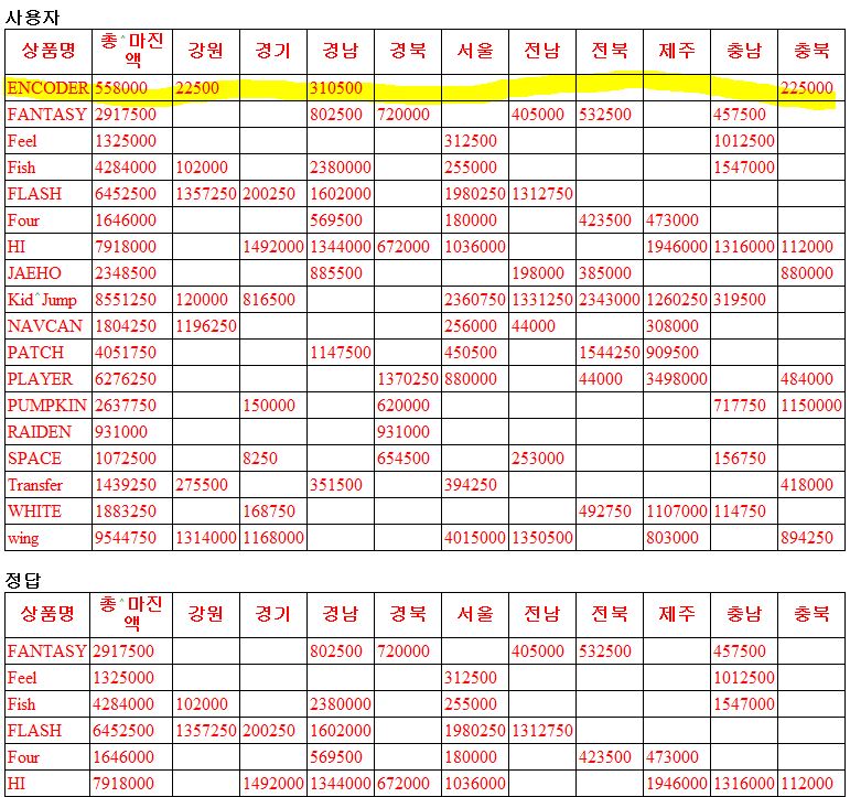 문제 파일의 상품 테이블에는 encoder 데이터가 있는데 정답 파일에는 없네요. 중간에 삭제된 것 같습니다.