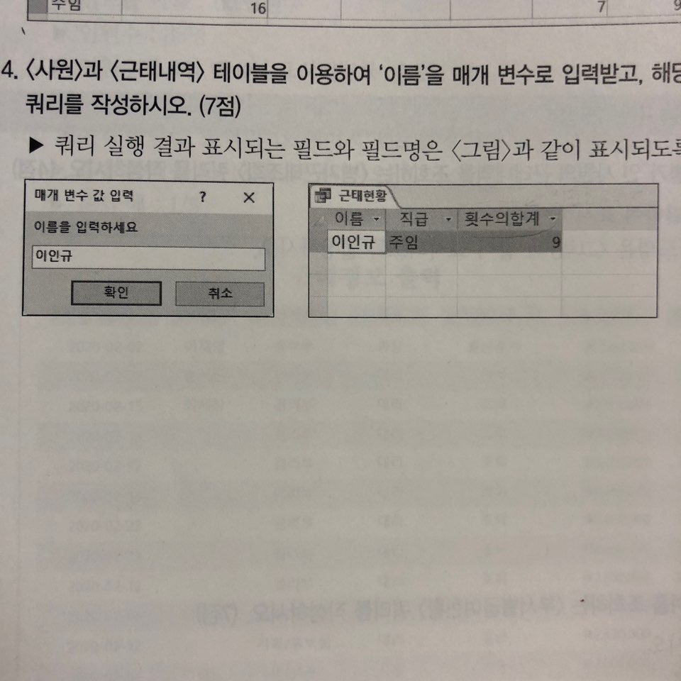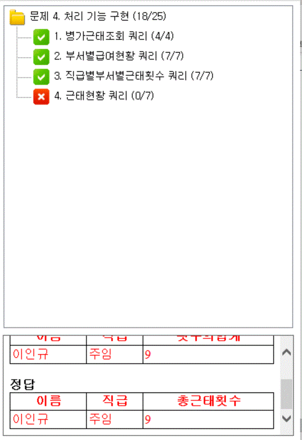 책에 나온 사진대로라면 <이름>, <직급>, <횟수의합계> 순서대로 필드가 들어가야하는데 채점을 해보니 <횟수의합계> 대신 <총근태횟수>가 들어가 있더라구요
