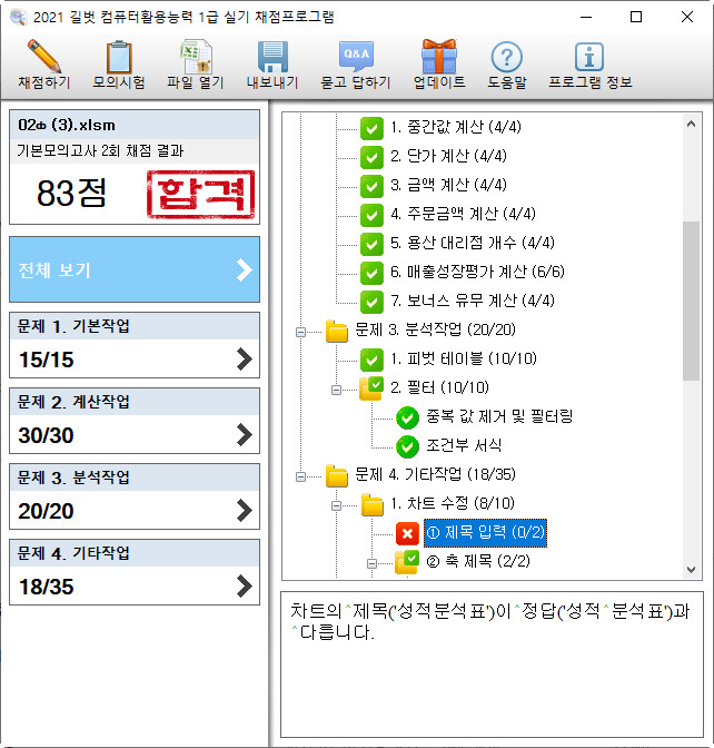 올려주신 파일을 채점하면 아래와 같이 채점됩니다. 다시 한번 채점해 보시기 바랍니다.