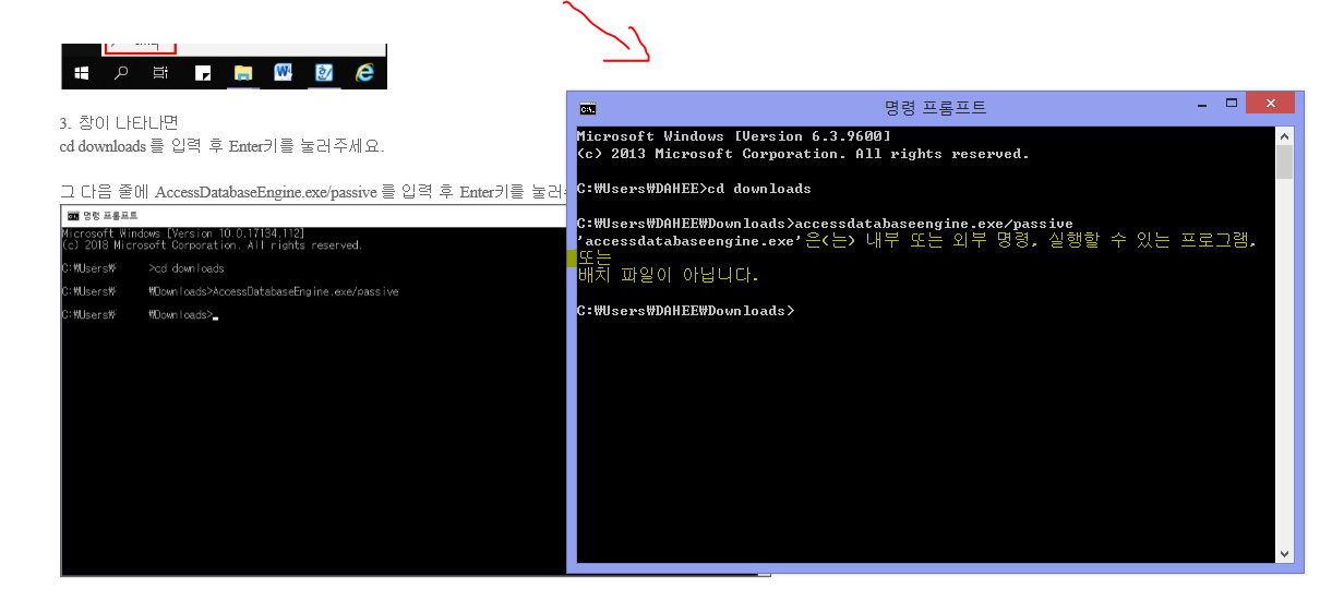 downloads 폴더에 accessdatabaseengine.exe 파일이 없는 것 같습니다.