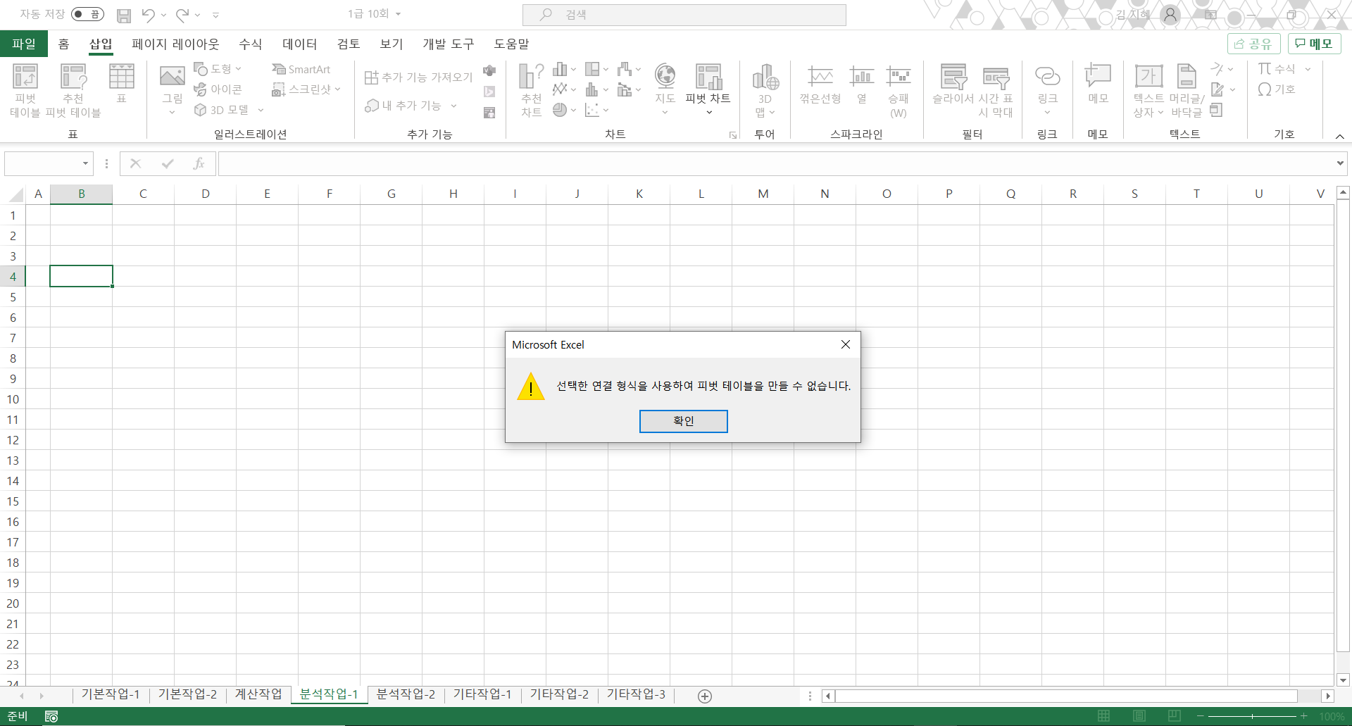 데이터 모델에 이 데이터 추가를 체크 하지 않으면 해당 메시지가 표시됩니다.