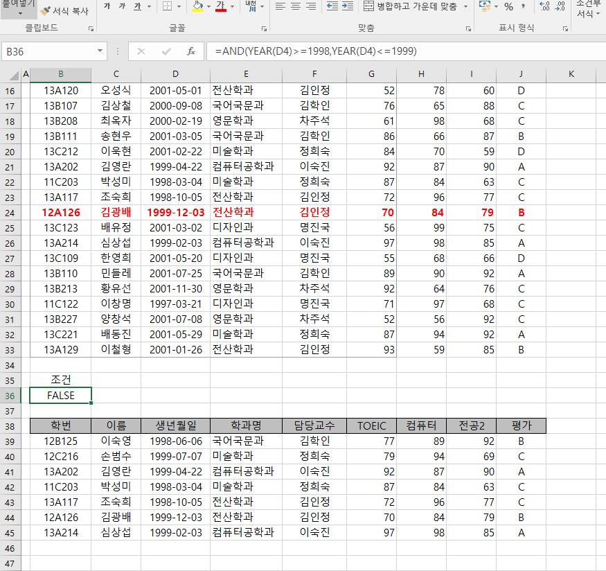 =and(year(d4)=1998, year(d4)=1999) 로 작성하면 1998 이고 1999 인 값을 구하게 되는데 그런 값은 없기 때문에 결과가 나오지 않겠죠.