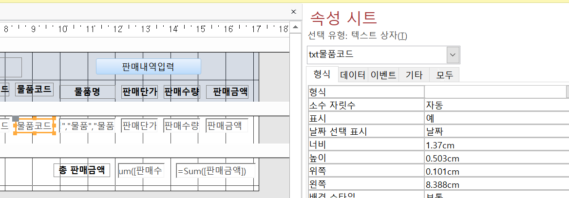 물품코드가 있는 테이블을 디자인 보기로 열어서 데이터 형식을 확인하라고 하셨는데 <물품>테이블의 물품코드 데이터형식은 아래사진처럼 '짧은 텍스트'로 설정되어있고 <판매내역입력>폼의 txt물품코드 컨트롤의 데이터형식은 형식란도 비워져있고 확인할 방법을 모르겠는데 어떻게 해아하나요?
