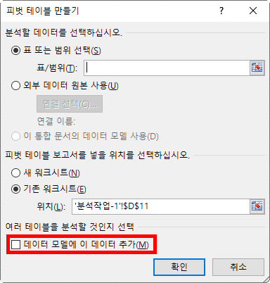 외부 데이터를 삽입한 후 넣을 위치를 넣을 때 반드시 '데이터 모델에서 이 데이터 추가'를 선택해야 합니다. 이것을 선택하지 않으면 cvs 파일이 불러와 지지 않습니다.