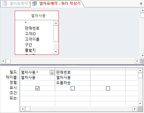 SELECT문을 사용하지 않고 아래 그림 처럼 쿼리 작성기를 이용해서 작성해도 됩니다. 레코드 원본 속성에서 작성기 단추(...)를 클릭하여 쿼리 작성기를 이용해서 지정하면 프로그램이 자동으로 SELETE 문으로 변경하여 레코드 원본에 표시합니다.