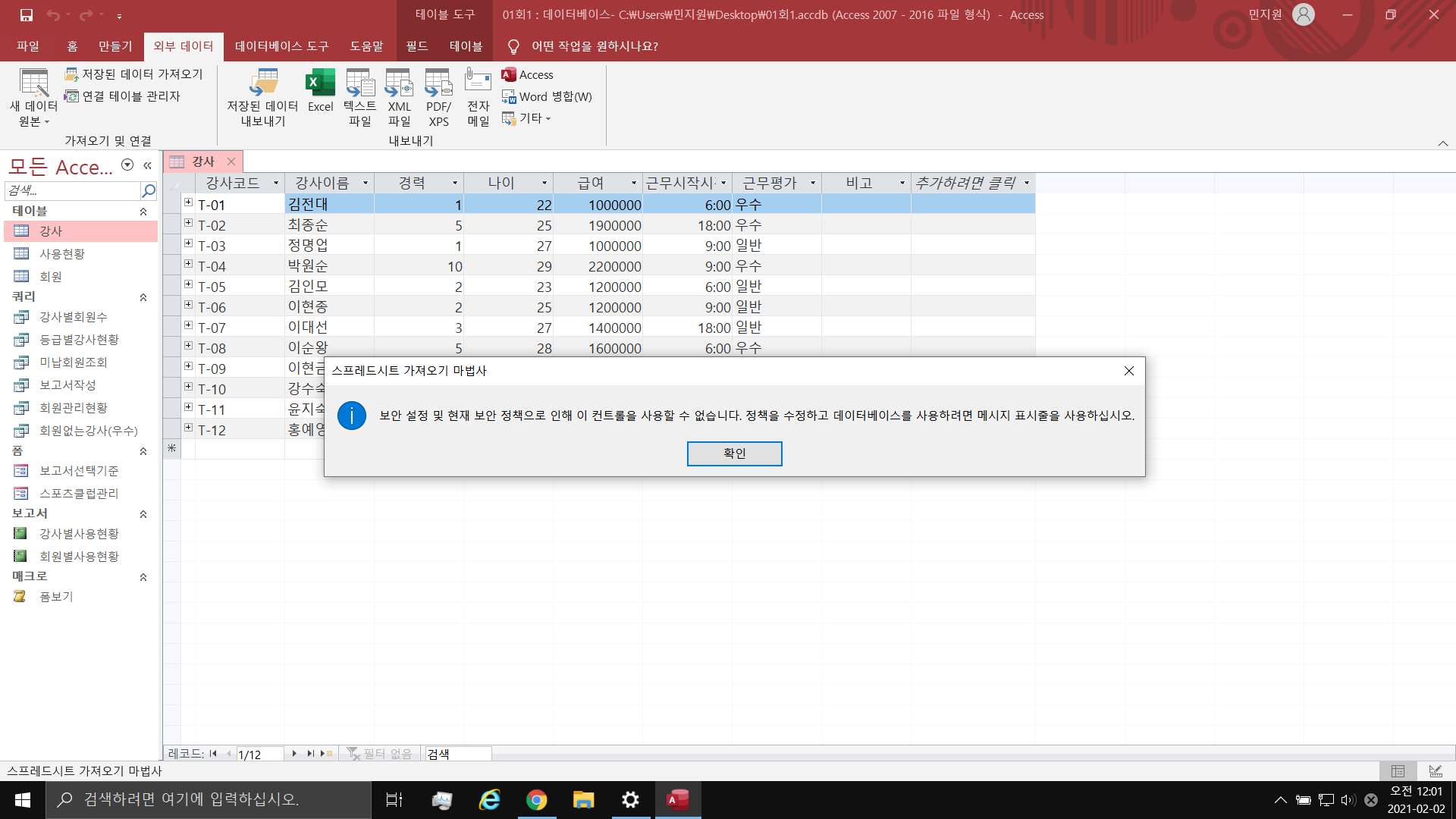 다시 MS프로그램을 다시 다운 받아서 사용하려고 하니까 이번에는 이 창이 뜨는데 이런경우에는 어떻게 해야합니까??? 지금 상황은 제가 엑세스에서 엑셀 파일을 가져오려고 하는 상황입니다 가져오기를 누르고 파일을 설정하고 완료를 하면 이런 창이 뜹니다