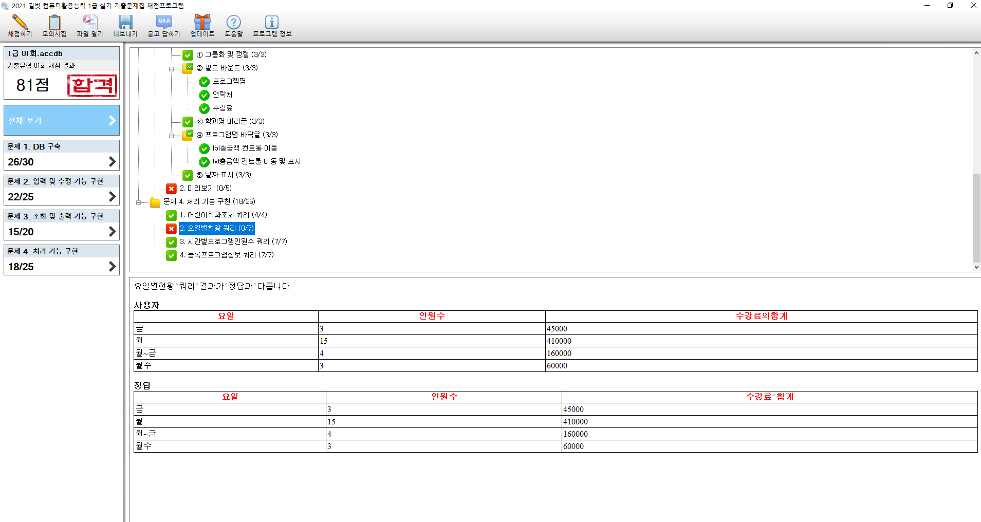 맨 마지막 필드 명이 달라서 감점된 것입니다. '수강료 합계'로 하셔야 하는데, 님은 '수강료의합계'로 작성하셨습니다.