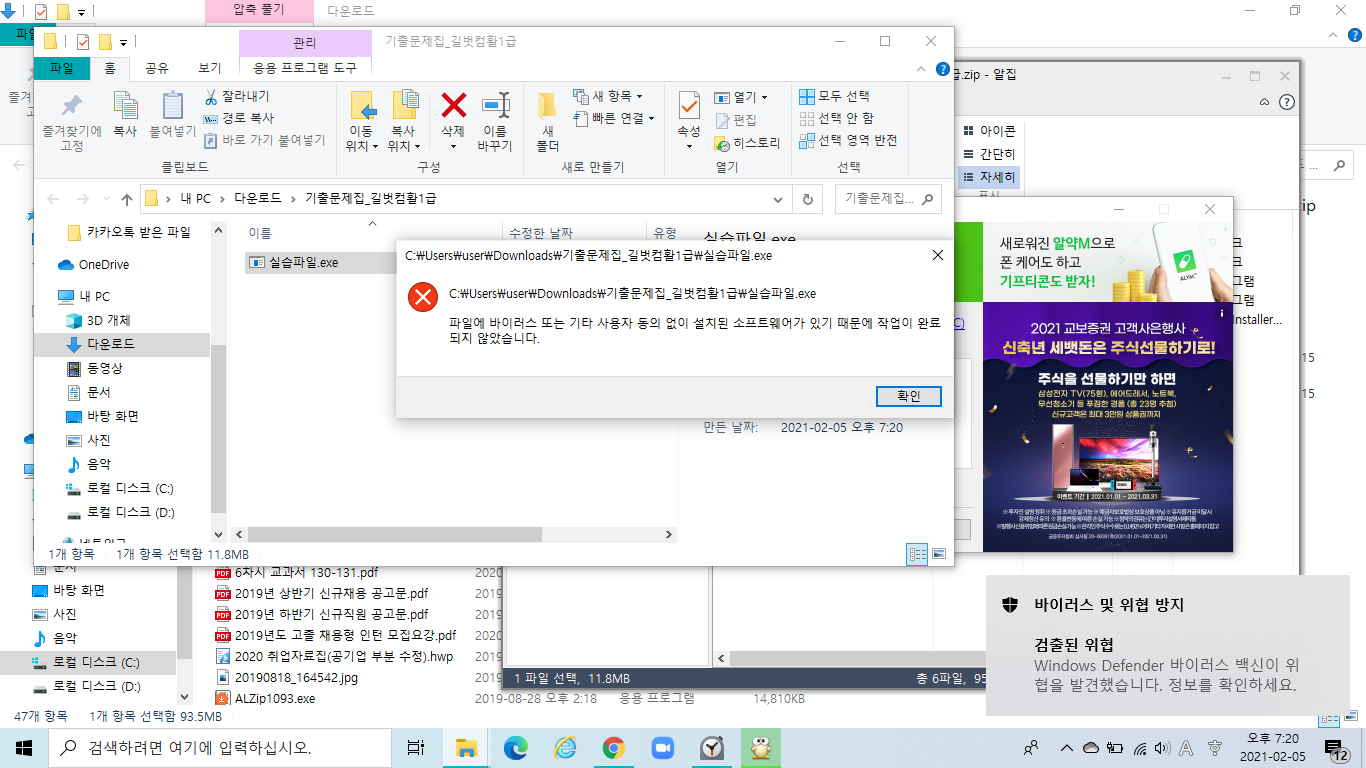 실기 실습파일을 다운 받는데 자꾸 이러한 창이 뜨네요. 어떻게 해야하나요? 바이러스 알람도 계속 오네요