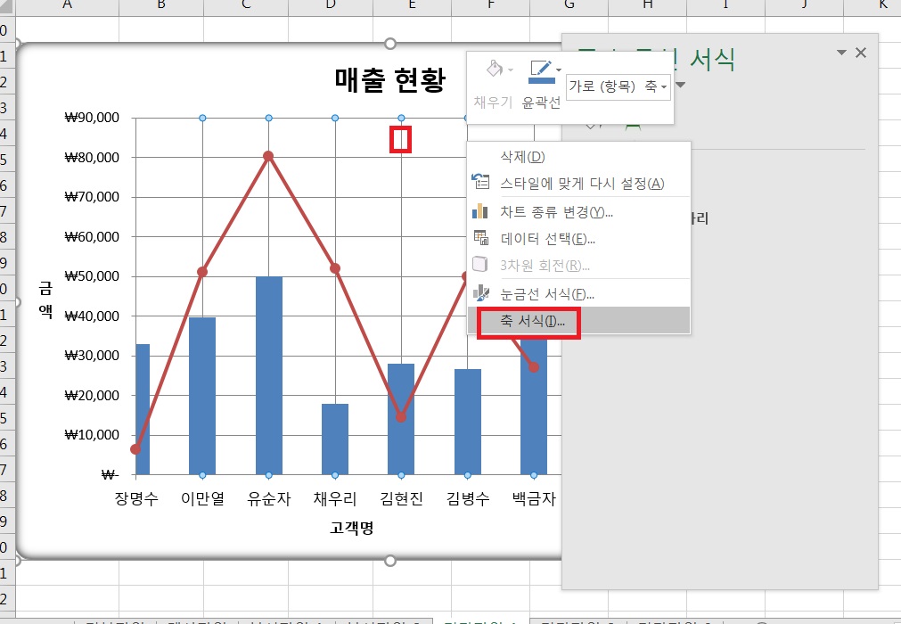 가로(항목 축)을 클릭 한 후 오른쪽 클릭 하시면 축 서식이 나오는데