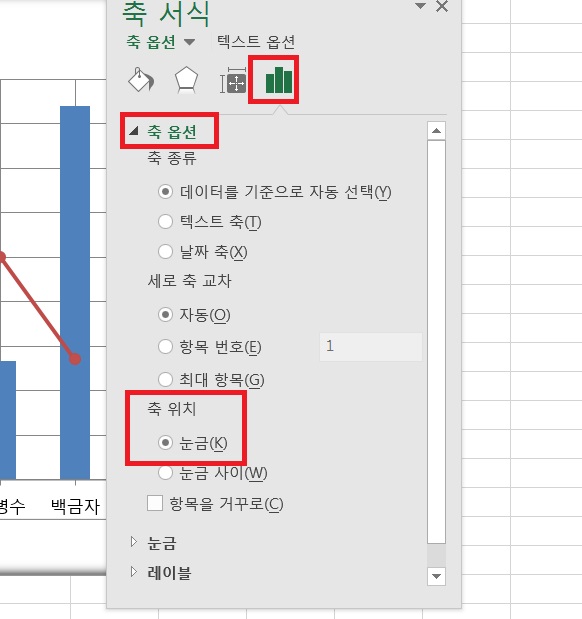 이것을 선택하면 나타나는 화면에서 축 위치를 눈금으로 지정하세요.