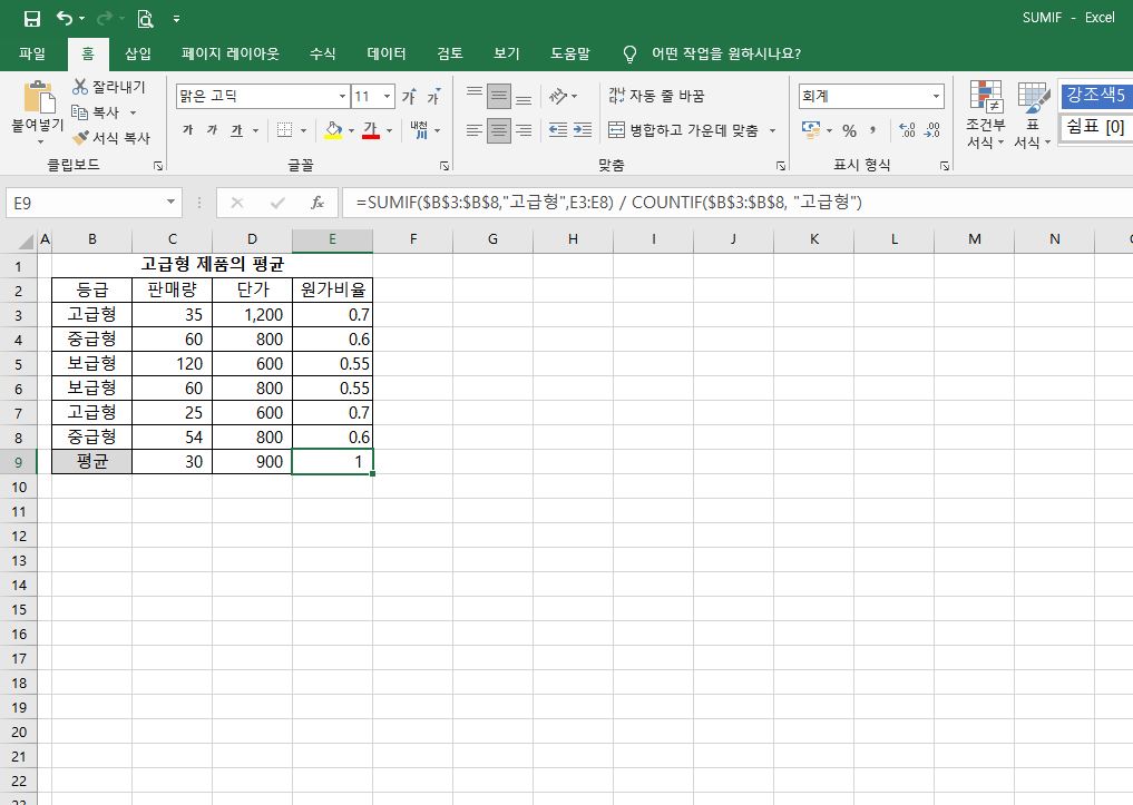 =SUMIF($B$3:$B$8,"고급형",E3:E8) / COUNTIF($B$3:$B$8, "고급형")