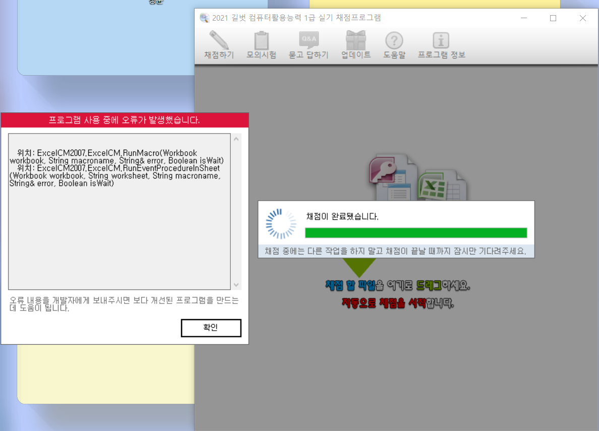 엑셀 기본모의고사도 넣어봤는데 여전히 엑셀은 아래와 같은 오류가 뜨네요.
