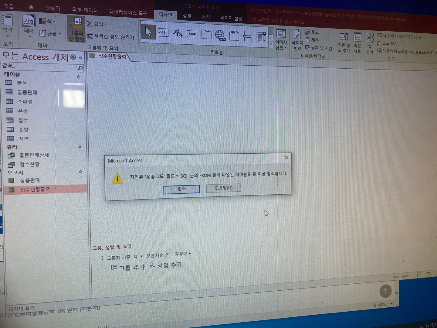 그룹머리글의 운송코드가 여러 테이블에 있는데 이를 지정하지 않아서입니다. 그룹머리글에서 운송코드를 아래와 같이 특정 테이블의 운송코드로 지정해주세요.