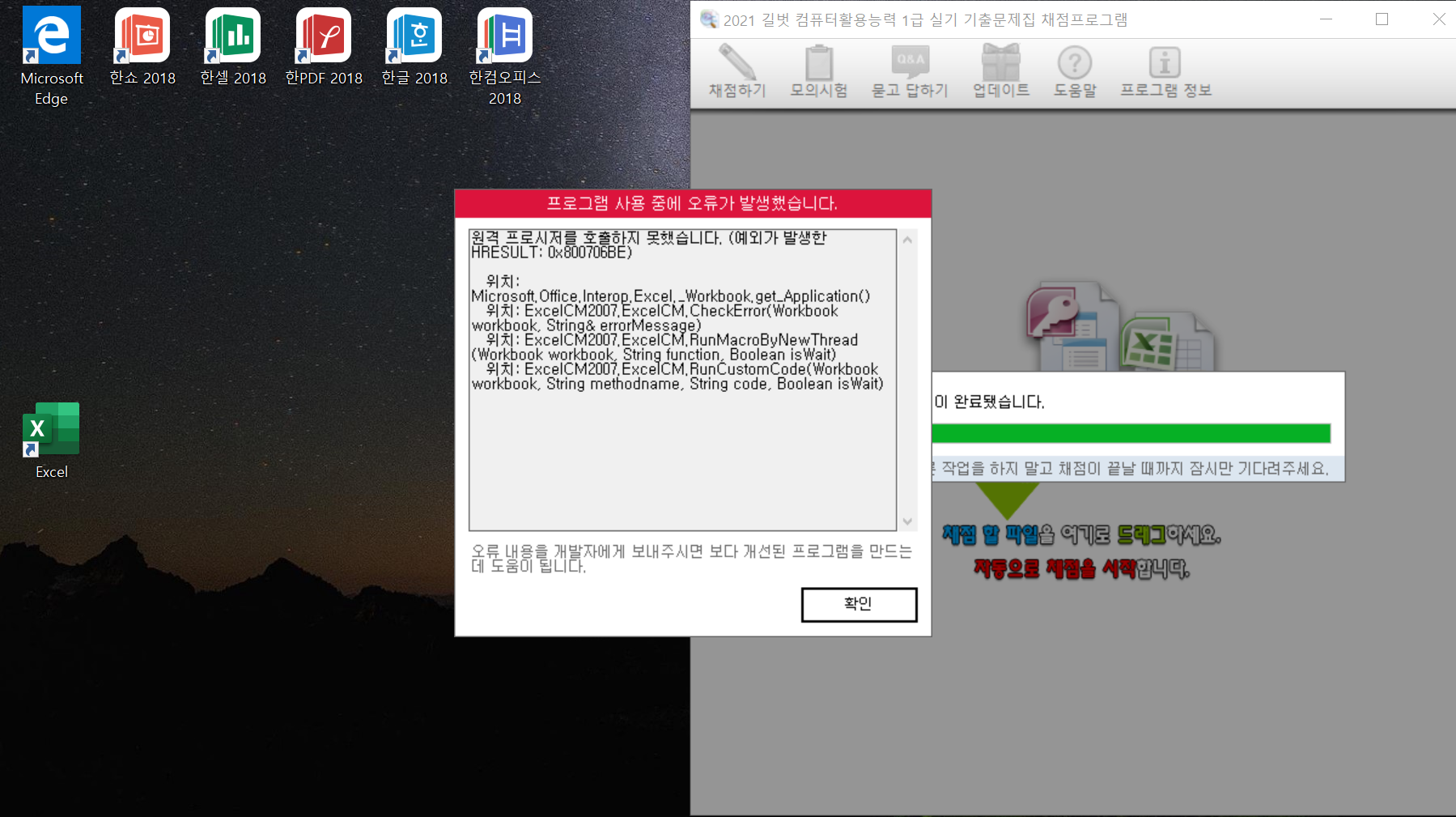 우선 2021 채점프로그램과 2016 오피스 사용중인 것이 맞으시죠?