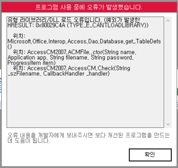 처음 채점프로그램 사용 시 두 번째 사진과 같은 오류 메세지가 출력되어 묻고 답하기의 답변에 따라 오피스 삭제/재설치 및 윈도우 재설치 후 오피스 재설치까지 했습니다. 이후 위 문제가 해결되어 사용하고 있었는데, 엑셀 파일은 채점이 가능하나 액세스 파일을 채점하려고 하니 첫 번째 사진과 같은 오류가 다시 발생하였습니다. 역시 묻고 답하기의 답변에 따라 오피스 삭제/재설치를 했는데도 여전히 같은 문제가 발생합니다. 며칠 전 윈도우 재설치를 했는데 다시 윈도우 재설치 과정을 거쳐야 하나요..? 시간을 너무 날리는 것 같아 답답해서 질문 남깁니다