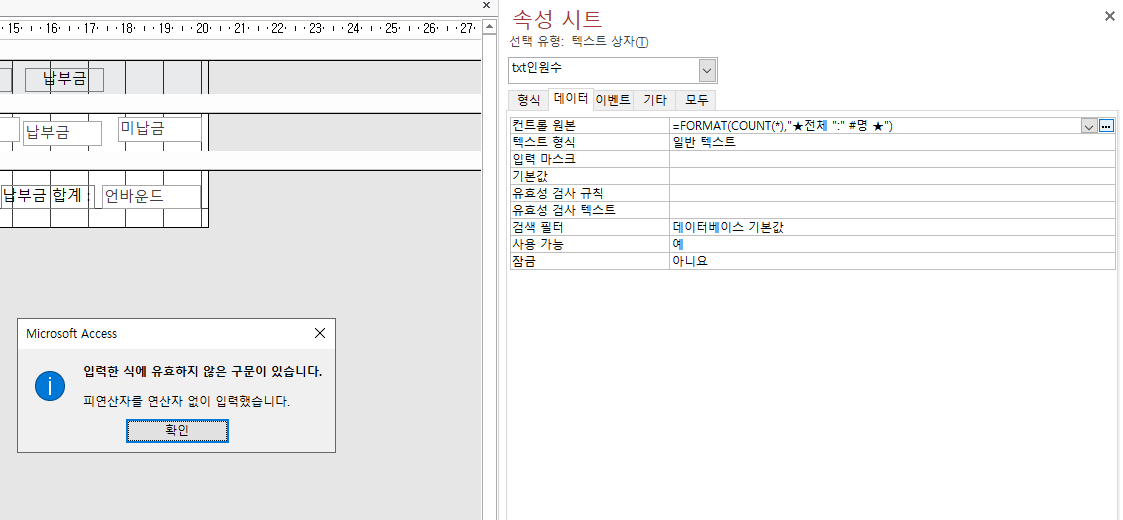 폼바닥글의 TXT인원수에 =FORMAT(COUNT(*),"★전체 ":" ##명★") 를 입력하고 엔터를 눌렀더니