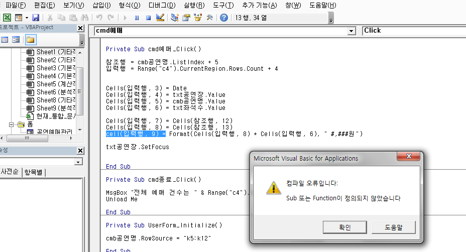 ① p126, 엑셀 기타작업-3의 2번 문제 제대로 입력한 것 같은데 sub 또는 function이 정의되지 않았다는 오류가 떠요