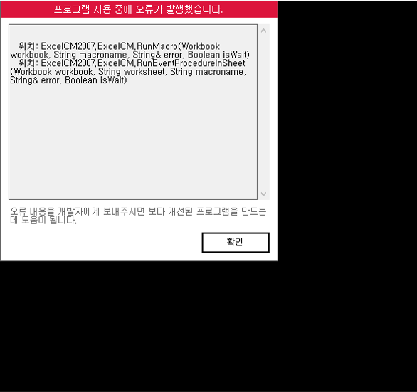 문의하신 오류는 윈도우 환경 문제로 비쥬얼 베이직 쪽에서 오류가 발생한 것으로 보여집니다.