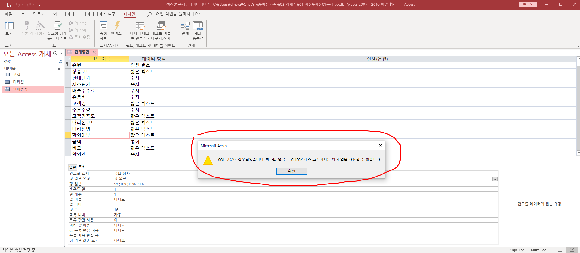 액세스 64쪽 2번 문제를 다 풀고 저장하면 첨부파일처럼 팝업창이 뜹니다.