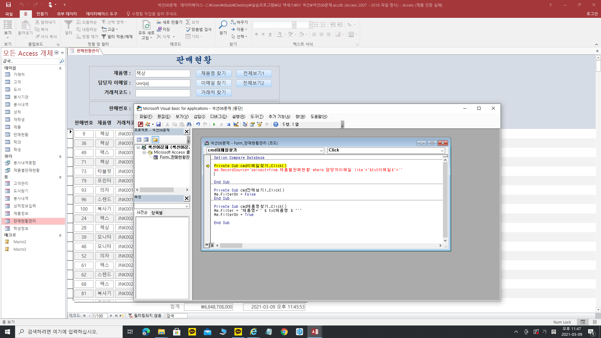 2. from 제품별판매현황을 쓸 때 156페이지에 <폼의 레코드 원본이 제품별판매현황이므로 ~>라고 나와있는데 이해가 잘 되지 않습니다ㅜ 제품별판매현황은 어디서 나온 말인가요..?