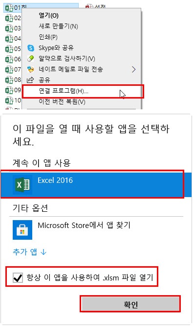 임의의 파일을 마우스 오른쪽 단추로 눌러 나타나는 바로 가기 메뉴에서 [연결 프로그램]을 선택한 후 Excel 2016을 선택하고 '항상 이 앱을 사용하여 xlsm 파일 열기'를 체크하고 <확인>을 클릭하면 됩니다.