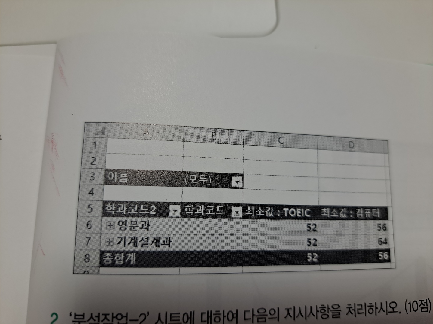 만약, 앞에서와 같이 그림에 '최소값 : TOEIC'이렇게 나온다면, 값필드 설정에서 '최소'로 설정하되, 위에처럼 값의 이름을 따로 '최소값'으로 변경해줘야 맞는 답으로 나오는 지 궁금합니다.