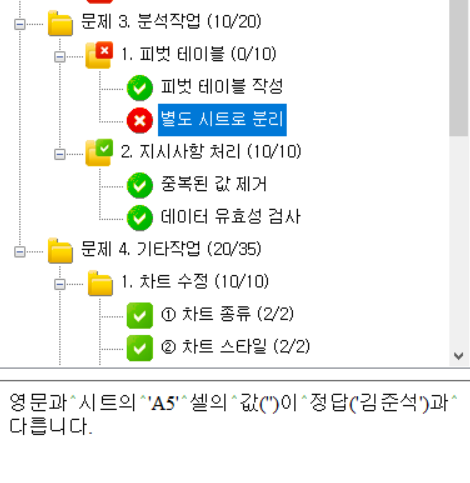 또한, 문제를 보면 어디에도 '김준석'이라는 데이터에 대한 언급을 찾을 수 없는데 채점프로그램을 돌렸을 때 'A5'셀의 값이 정답(김준석)과 다르다고 나옵니다!!!
