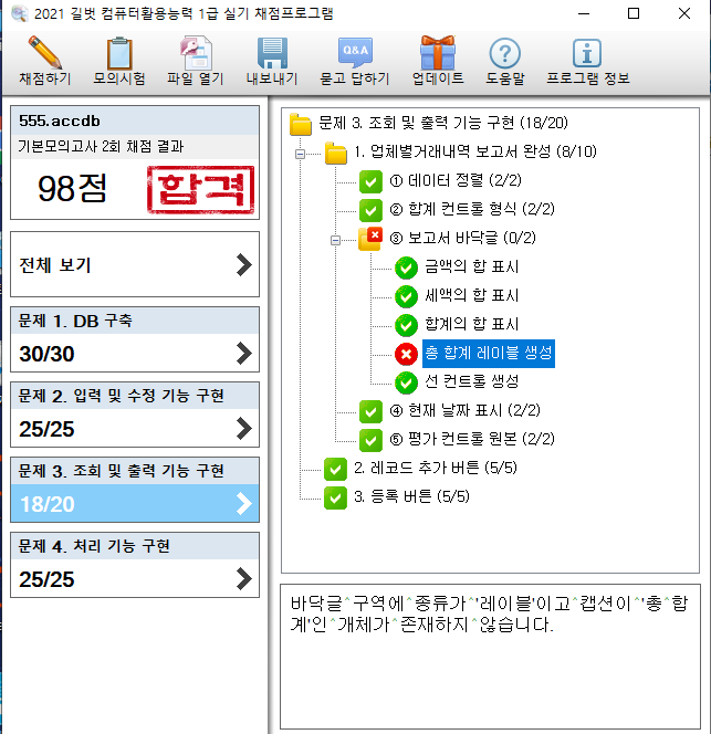 액세스 기본 모의고사 2회를 채점하면 레이블을 설정하였는데도, 아래처럼 채점이 됩니다.