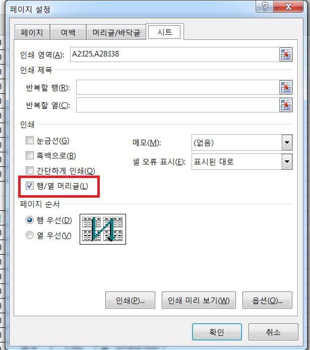 '행머리글 (1,2,3 등)과 열 머리글(a, b, c 등)이 안쇄되도록 설정하시오.'