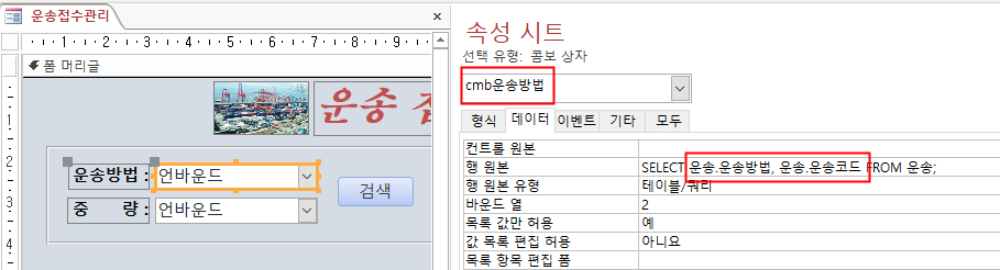 이곳에 표시할 대상이 <운송접수관리> 폼의 ‘cmb운송방법’이라고 했으니 해당 컨트롤을 확인해 봅니다.