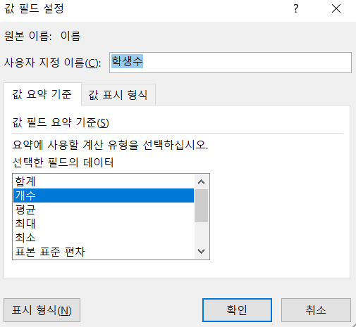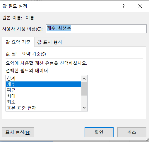 저는 사용자지정에서 '학생수 : 개수'로 변경을 했습니다. (아래에 제가 푼 방식이 첨부되어 있습니다.)