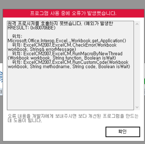 0x800706be 오류는 윈도우 환경 문제로 비주얼 베이직 쪽에서 오류가 발생한 것으로 보여집니다.