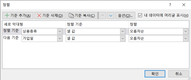 정렬 기준에 아래 사진과 같이 ① 번 매크로를 입력할 때 지정했던 정렬 기준들이 남아있습니다.