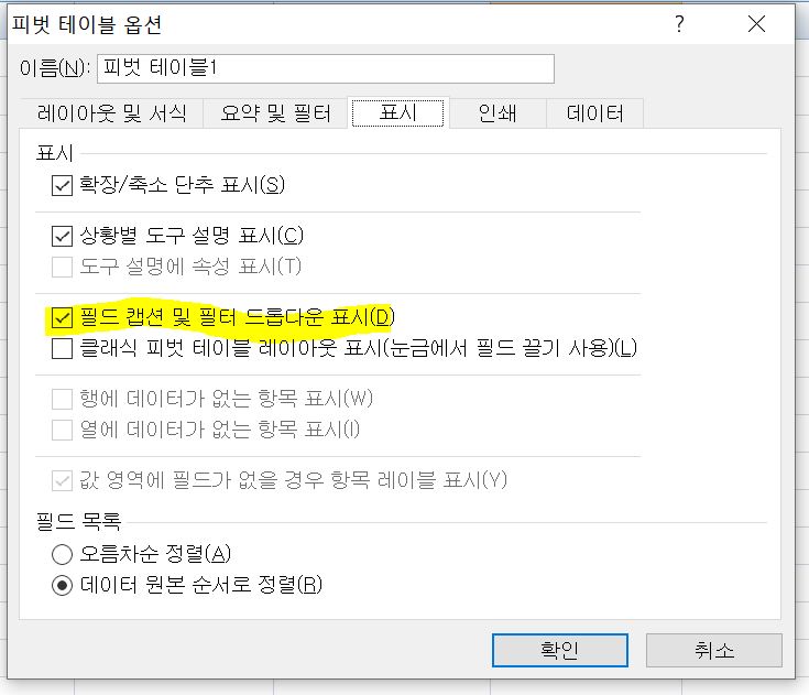 피벗테이블 옵션에서 '필드 캡션 및 필터 드롭다운 표시'의 체크를 해제했더니