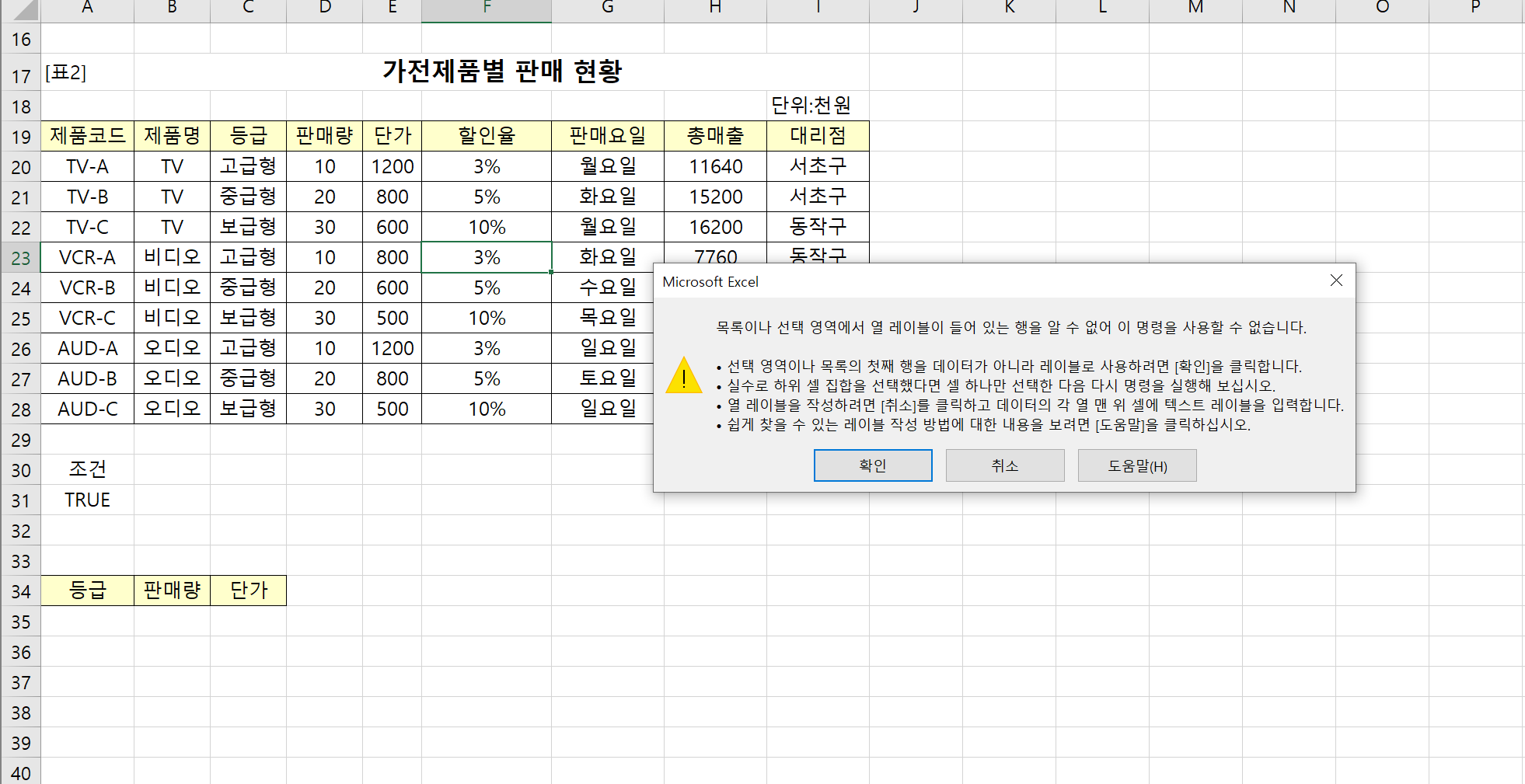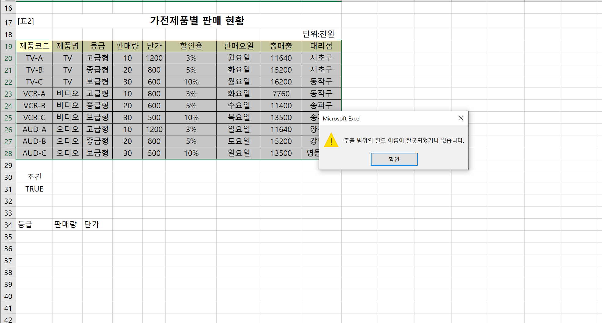 고급필터 조건을 쓰고 필터작업을 하려고 하는데