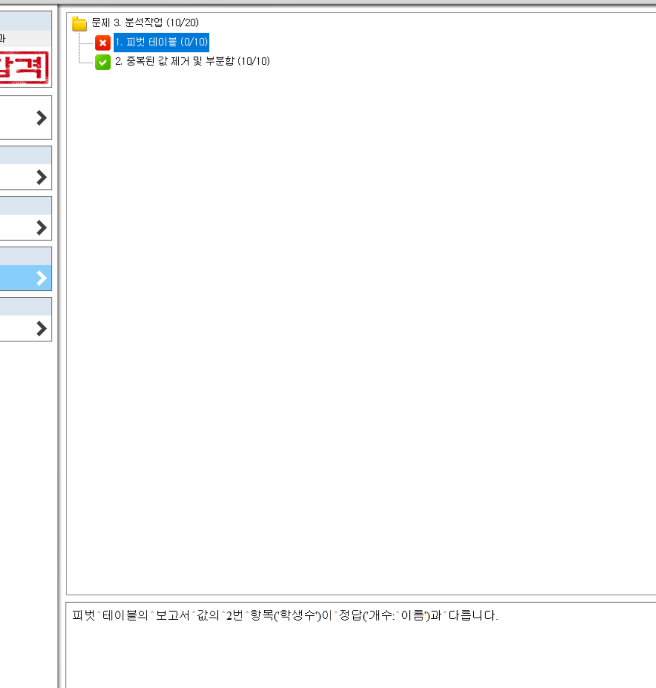 공부하는데 혼동을 드려 죄송합니다. 제가 직접 피벗 테이블을 작성하여 채점을 하면 감점되지 않는데 왜 위와 같은 현상이 발생했는지 모르겠네요. 채점 프로그램상의 문제인거 같은데, 보다 정확한 원인을 확인하려면 님이 작성한 액세스 파일이 필요합니다. 혹시 다음에 또 위와 비슷한 오류가 발생한다면 님이 작성한 액세스 파일을 올려주시기 바랍니다.