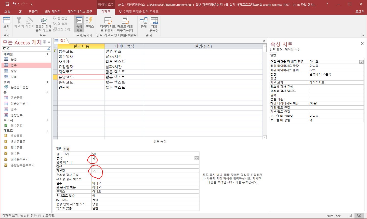 분명히 운송코드에 기본값에다가 "A" 적었고 형식 속성에 > 입력했는데 채점프로그램 돌리면 항상 틀렸다고 떠요