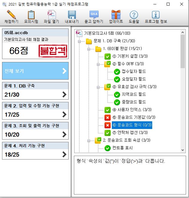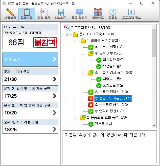2권 데이터베이스 기본모의고사 5회 채점프로그램 채점이 제대로 안되네요