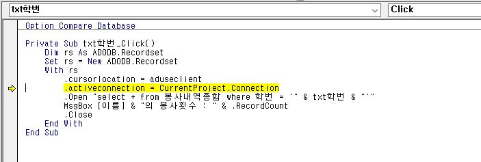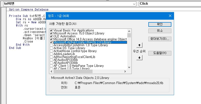 질문 내용만으로는 왜 안되는지 알수가 없습니다. Microsoft ActiveX Data Objects 2.0 보다 상위 버전을 추가해 보시고 그래도 안되면 님이 작성한 액세스 파일을 첨부해 주세요.