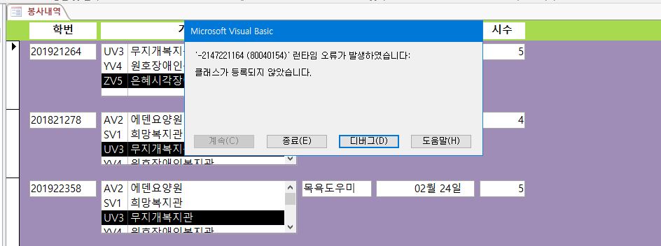 처음에 해설집에 적어두셨듯이 Ado 개체가 포함된 코드를 실행하면 컴파일 오류 메시지가 나와서 설정 하라는 대로 Microsoft ActiveX Data Objects 2.0 ~ 6.1 Library 중 하나를 선택하였지만 아래와 같은 오류가 또 나타납니다. 해결 방법을 알려주세요...ㅠㅠ