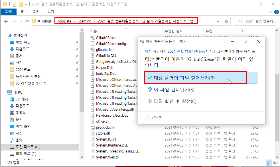 c) 복사한 GilbutCS.exe을 a) 폴더에 덮어쓰기