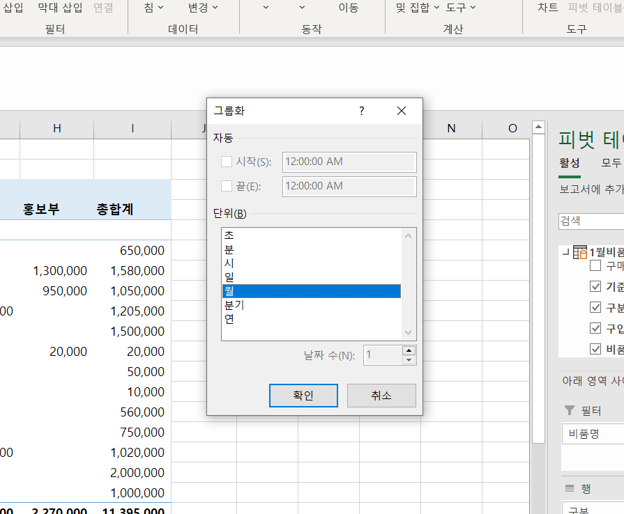 결산월을 그룹화하려고 했더니 사진처럼 설정을 못하도록 막혀있네요