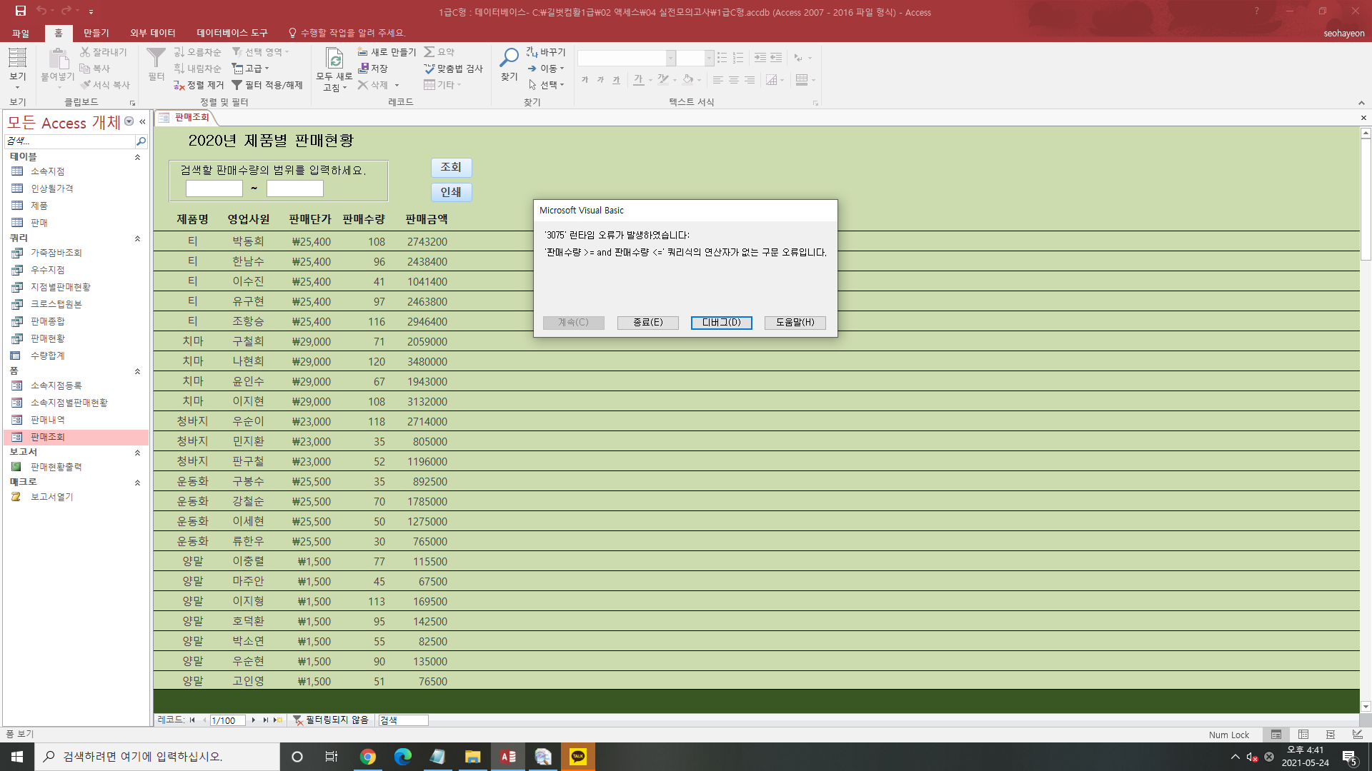 액세스 실전모의고사 C형 문제3-02. 조회 단추에 클릭 기능 구현하기