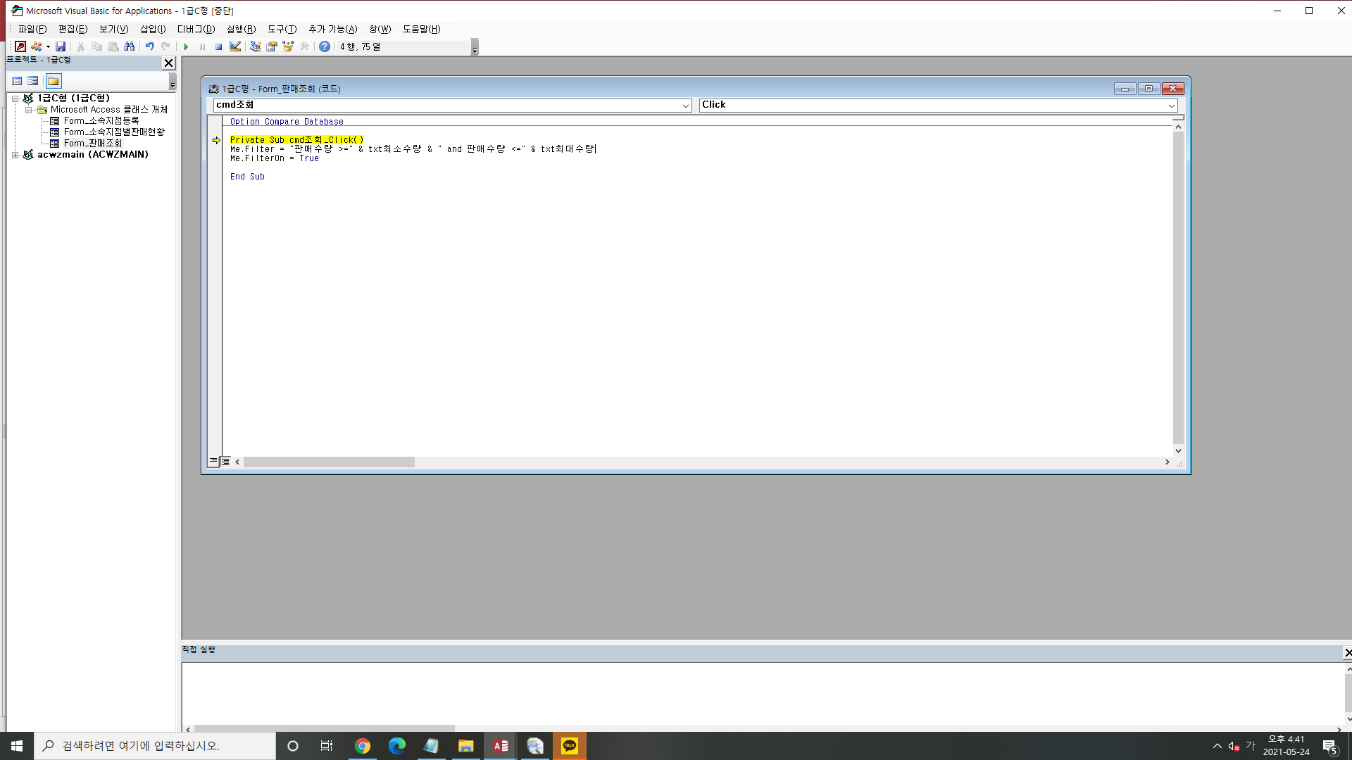 액세스 실전모의고사 C형 문제3 - 2번 문제 조회 단추에 클릭기능 구현하기