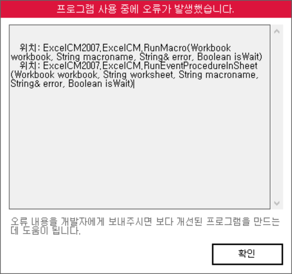 문의하신 오류는 윈도우 환경 문제로 비쥬얼 베이직 쪽에서 오류가 발생한 것으로 보여집니다.